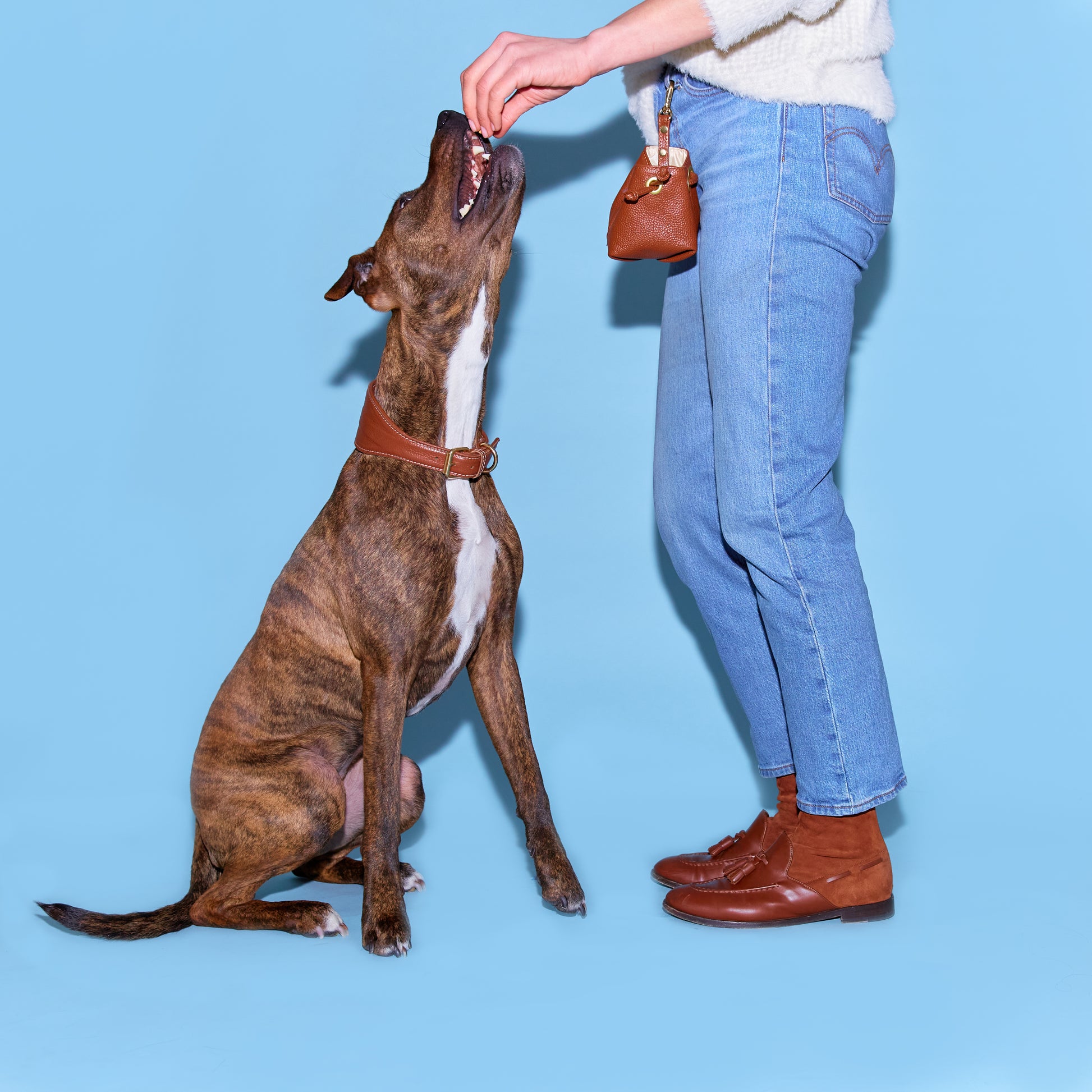 Treat and train your pooch, with this hand-stitched high quality, genuine soft leather treat bag carrier. These treat bag carriers are designed so you can match with your pooch in a variety of colors that are set off by gold/silver plated brass details.