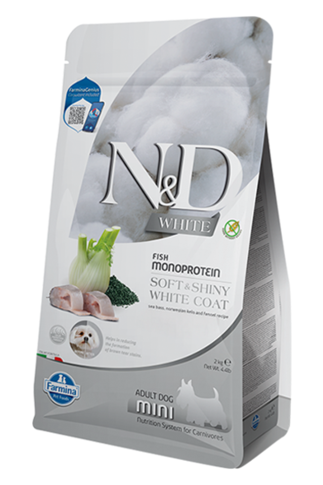 Introducing N&D White - Sea Bass, Kelp & Fennel. A premium mono-protein diet specifically developed to support healthy, shiny, and stain-free coats—especially for white or light-coated dogs. With functional botanicals like kelp and fennel, this nutrient-dense formula enhances overall health and helps maintain coat clarity and brightness.