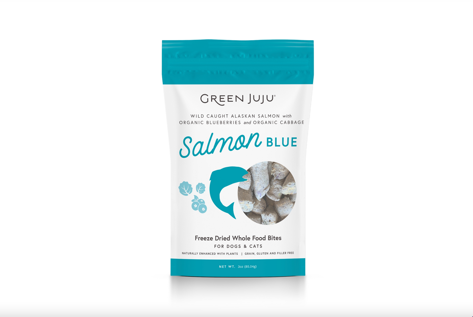 Introducing Green Juju: Freeze-Dried Whole Food Topper - Salmon Blue: These whole-food bites, combine wild-caught Alaskan salmon with colorful organic fruits and vegetables rich in vitamins, minerals, and antioxidants to produce freeze-dried whole food bites. These wholesome bites can be enjoyed as high-value treats or used as a nutrient-dense meal topper suitable for dogs and cats of all ages.