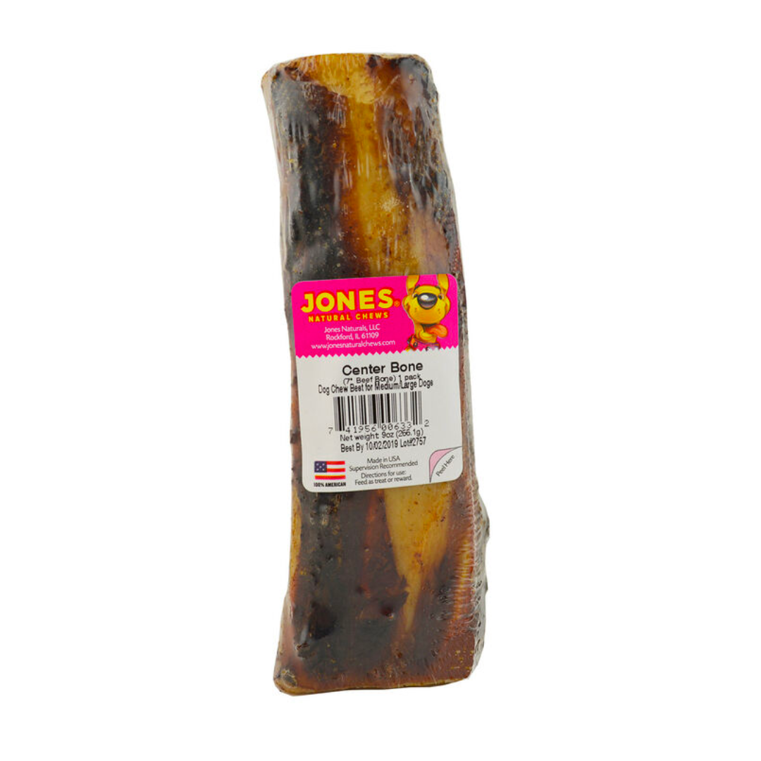 7” Center Bones is Jones’ top seller. Most of these bones will have succulent marrow in the middle of the bone along with tasty meaty pieces left on the bone. Each of our center bones is dipped in natural liquid smoke and then slowly roasted. They are USA natural beef femur or tibia bones with no artificial ingredients. These are best for medium to large size dogs. All Jones’ products are grown and made in the USA.