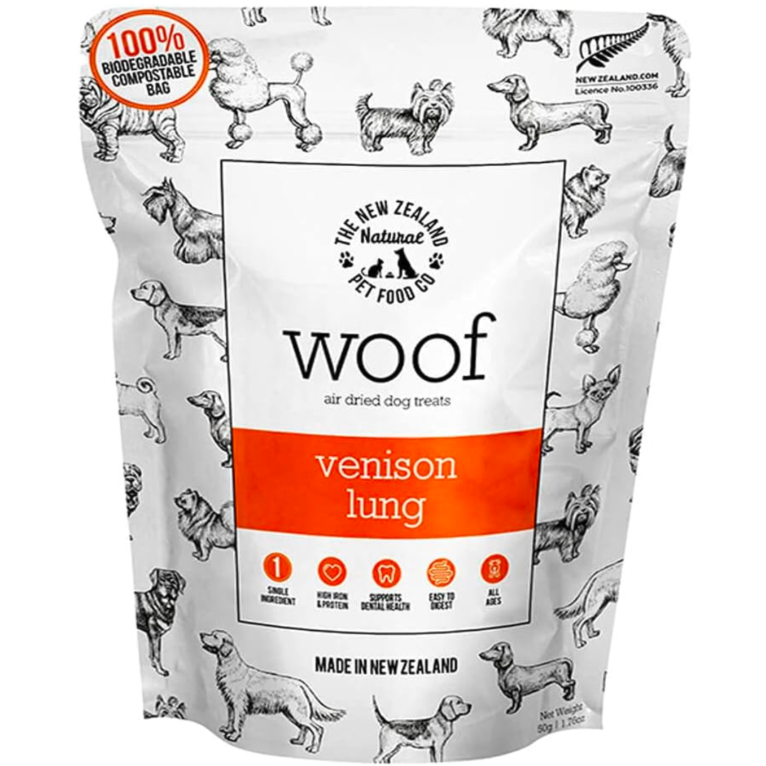 The New Zealand Natural Pet Food Co.'s Woof Venison Lung Air Dried Dog Treat is not just delectably tasty but also packed with health benefits. Made from free-range New Zealand venison, it's digestible and excellent for pups with sensitivities. The gentle air drying process seals in all the nutrients, offering a crunchy morsel that aids in dental care. With venison lung's high protein and iron content, yet low in fat, it's a treat that's both irresistible and beneficial for your furry friend.