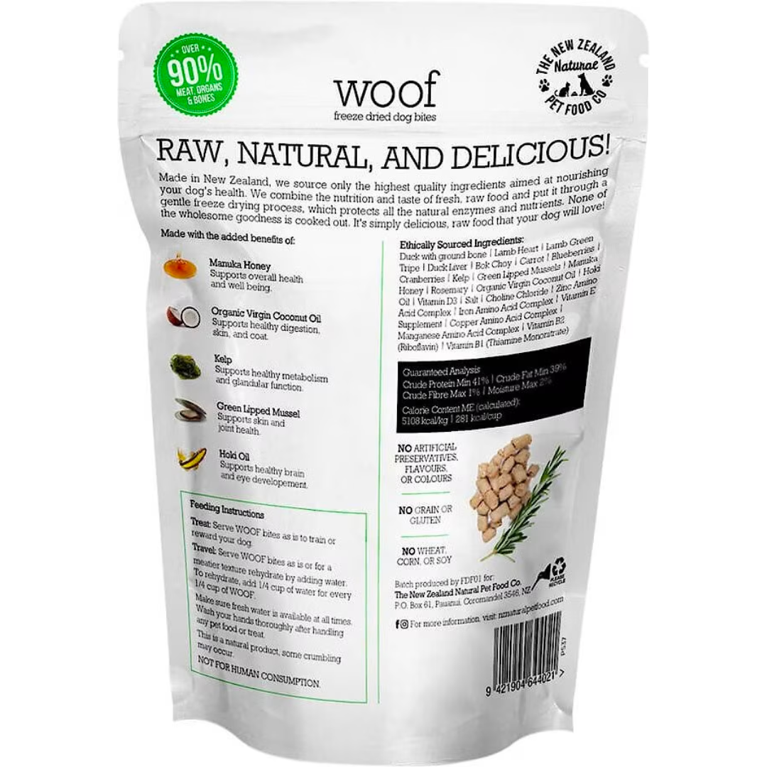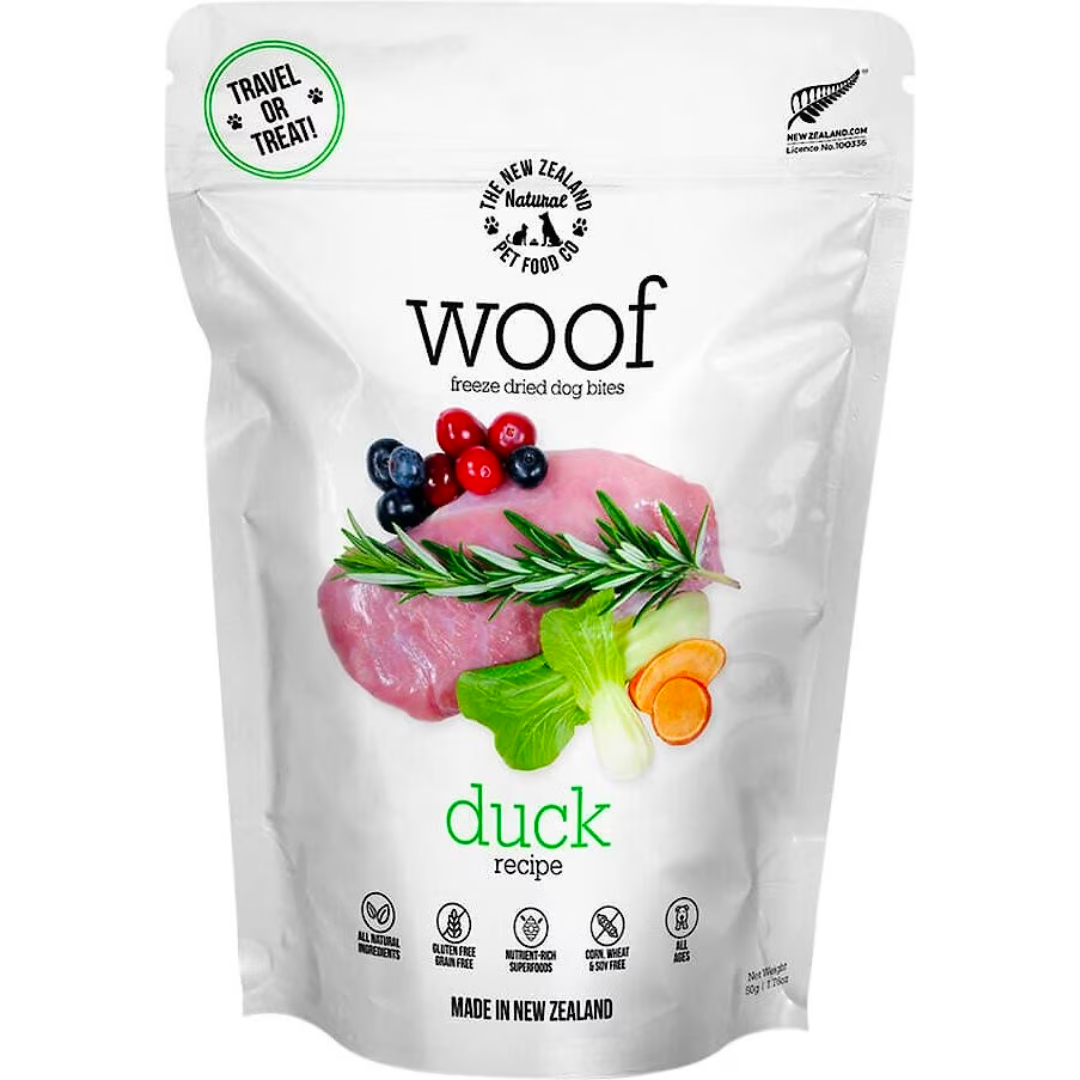 The New Zealand Natural Pet Food Co.'s Chicken Freeze-Dried Food 1.76oz is not just delectably tasty but also packed with health benefits. Elevate playtime and training with the savory punch of New Zealand Natural Woof Duck Treats. Expertly crafted, these freeze-dried morsels are packed with superior ingredients, such as cage-free duck and a range of superfoods. Their protein-packed composition ensures robust nutrition in every bite. Perfect as a training reward or a nourishing treat, or mixer/topper to food. They can be enjoyed as crunchy bites or rehydrated for a more succulent texture. Their versatility means they're great for any mealtime occasion, whether you're cozy at home or adventuring on the road.