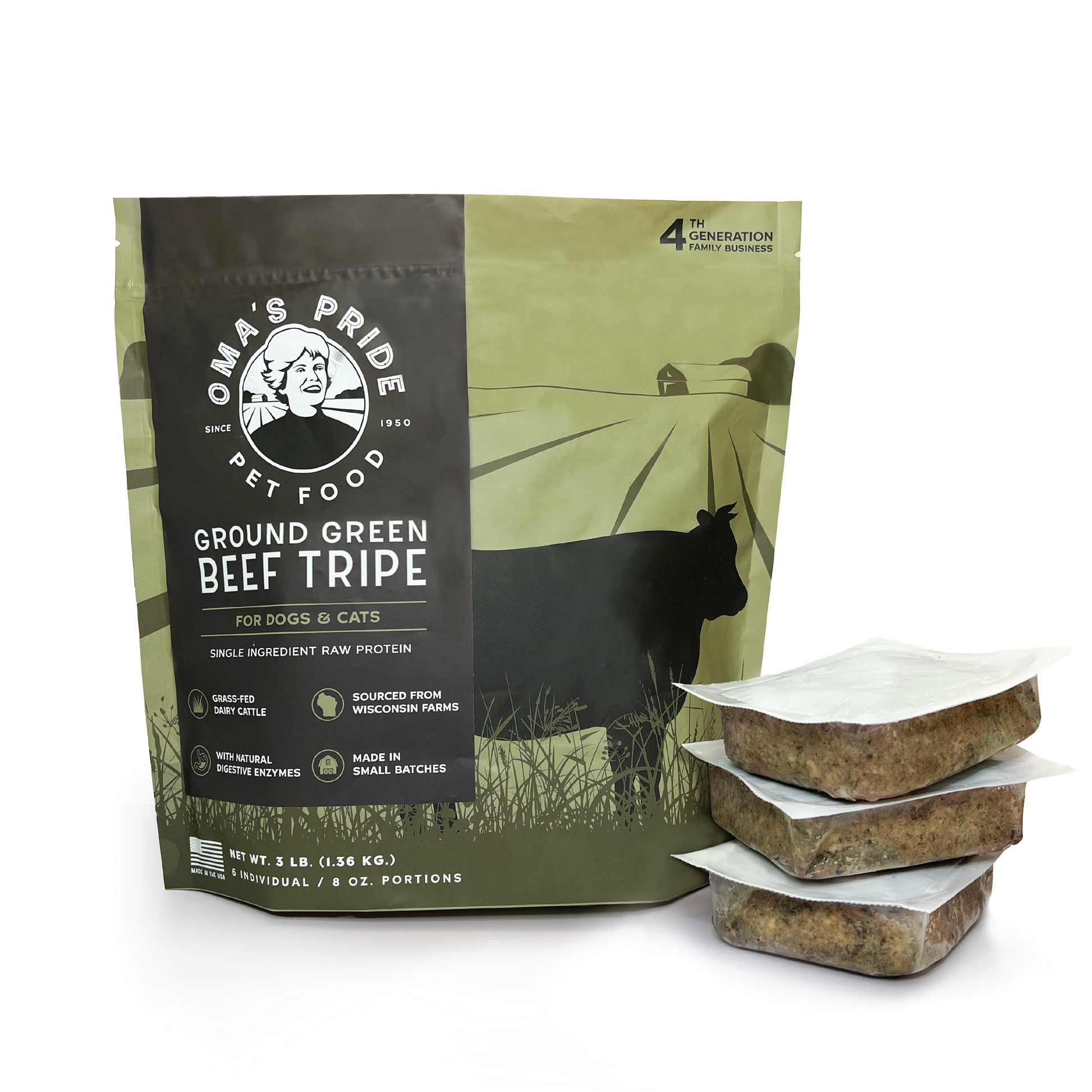 Introducing Oma’s Pride - Ground Green Beef Tripe, sourced from grass-fed cattle raised on Wisconsin farms in the USA. Unbleached to preserve its natural enzymes, essential amino acids, and pre and probiotics, it's an ideal choice for promoting healthy digestion and a robust immune system. Finely ground and free of grains and fillers, it's a smart addition to a carnivore-focused diet, ensuring the quality your pet deserves for a healthy and happy life. Please note, this food has a strong natural odor that pets love but may be off-putting to humans. However, its benefits far outweigh any scent concerns.