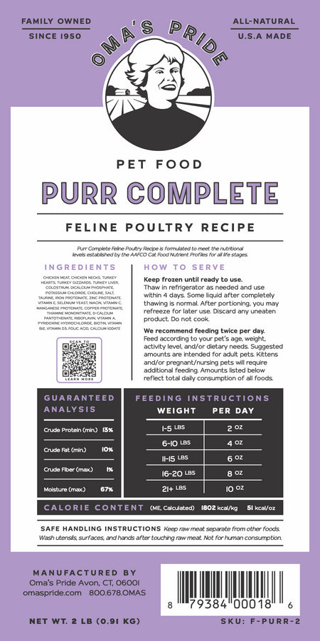 Introducing Purr Complete Feline Poultry Recipe is a complete raw meal formulated exclusively for cats'. Made with USA-sourced antibiotic-free poultry meat, organs, and bones blended with nutritious colostrum and a specialty nutrient mix. Free of grains, fruits, and vegetables for a naturally carnivorous feline diet.