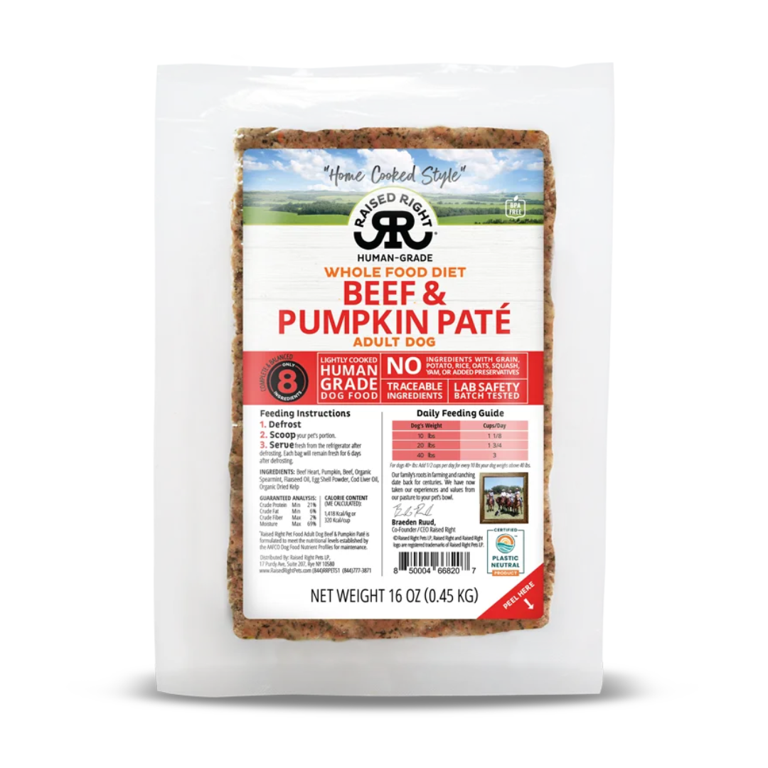 Introducing Raised Right: Pate for Adult Dogs - Beef & Pumpkin 1lb. Partnering with veterinarian Dr. Karen Becker and pet food formulation expert Steve Brown, we formulate whole food recipes tailored to each pet's life stage using limited, high-quality ingredients. Our recipes feature a single source of animal protein and are free from preservatives and high-carb fillers like potato, rice, oats, and more.