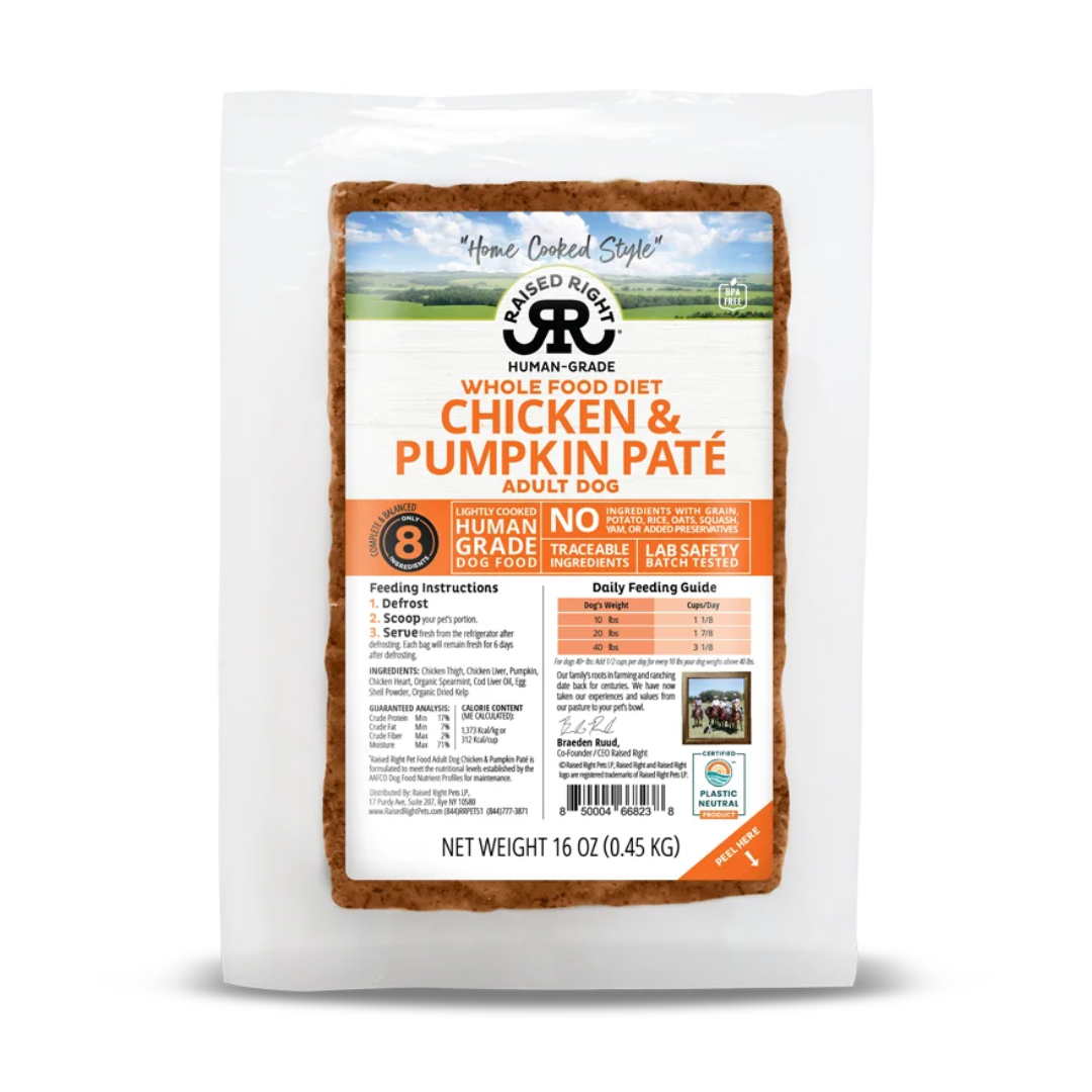 Introducing Raised Right: Pate for Adult Dogs - Chicken & Pumpkin 1lb. Partnering with veterinarian Dr. Karen Becker and pet food formulation expert Steve Brown, we formulate whole food recipes tailored to each pet's life stage using limited, high-quality ingredients. Our recipes feature a single source of animal protein and are free from preservatives and high-carb fillers like potato, rice, oats, and more.