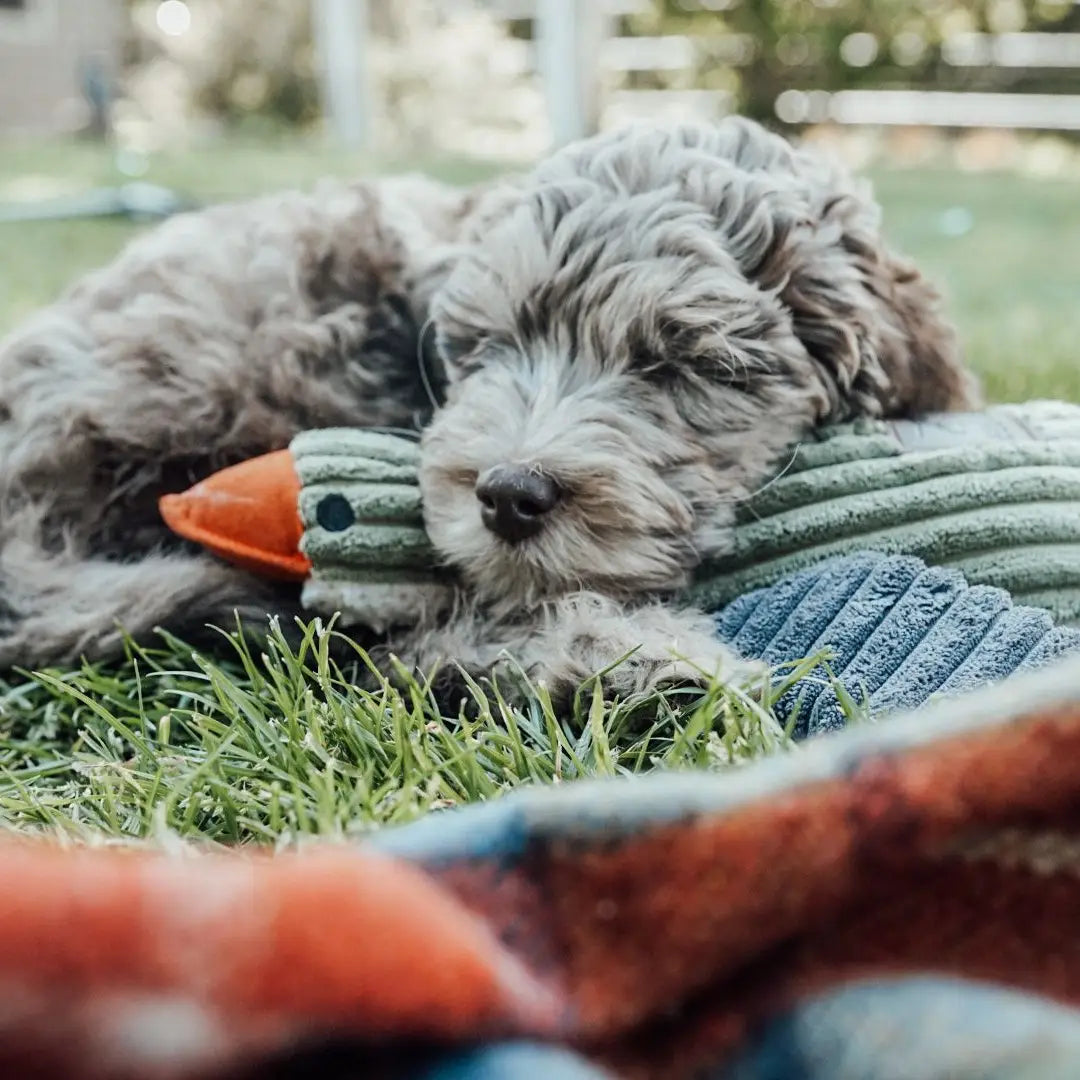 • 12" plush duck squeaker toy designed with reinforced mesh fabric for superior durability
