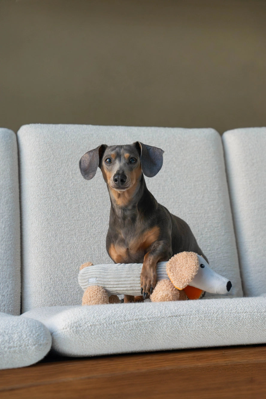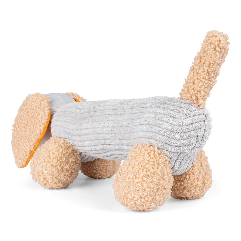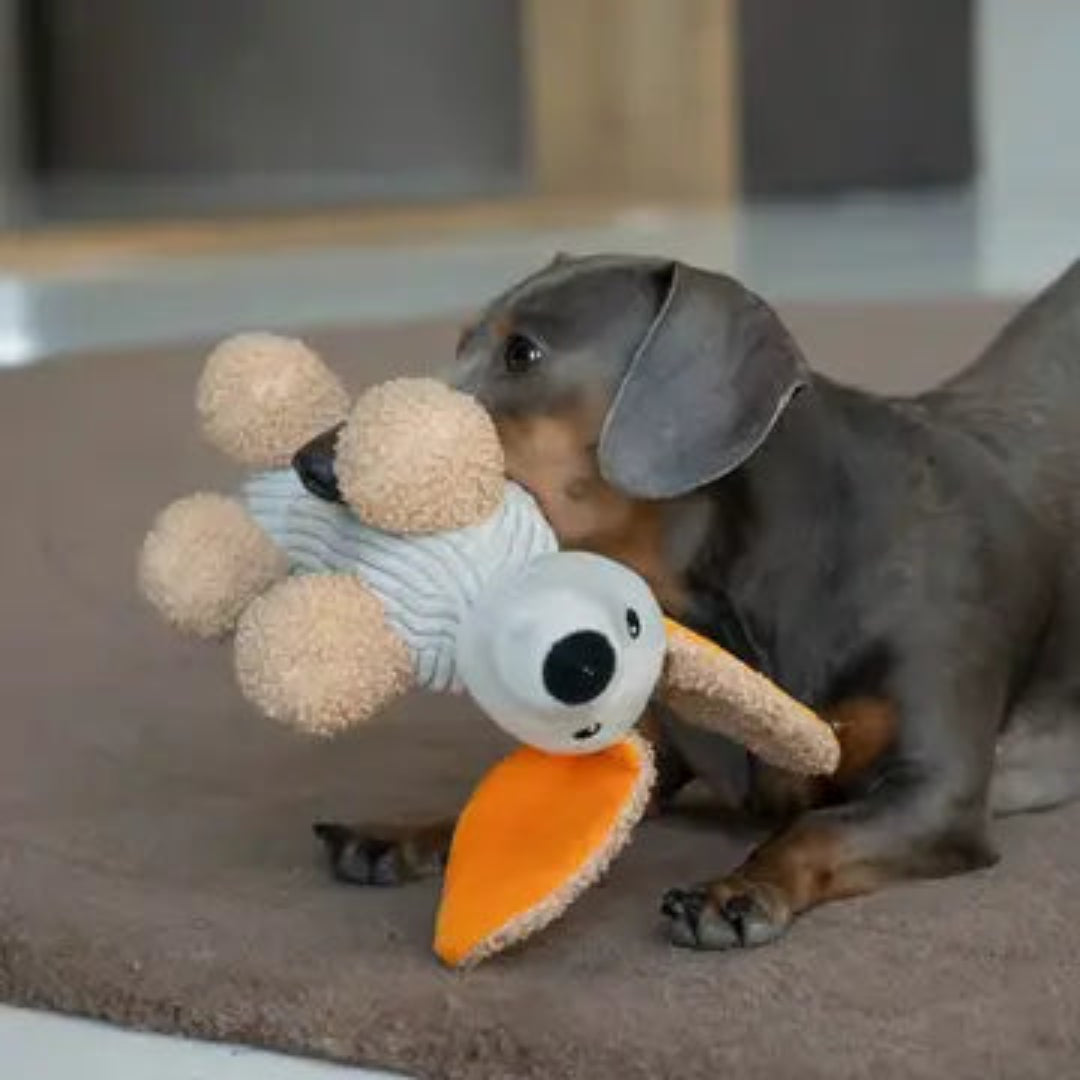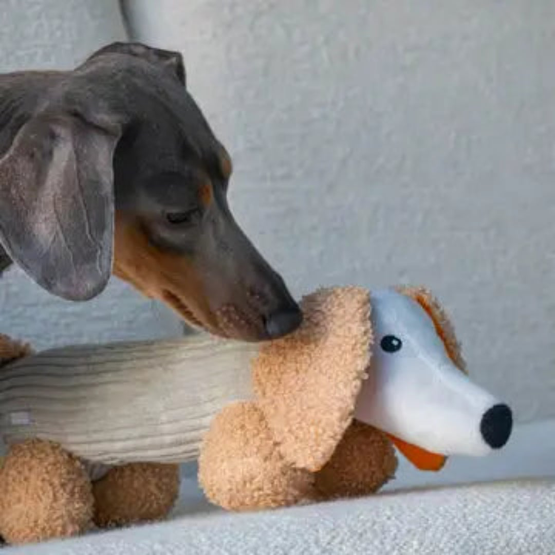 Introducing Micky! This dachshund plush is sure to become your pup's newest companion. With its soft exterior, hidden squeaker, and crackling ears in a bright orange hue, Micky is the perfect playtime pal for your dog.