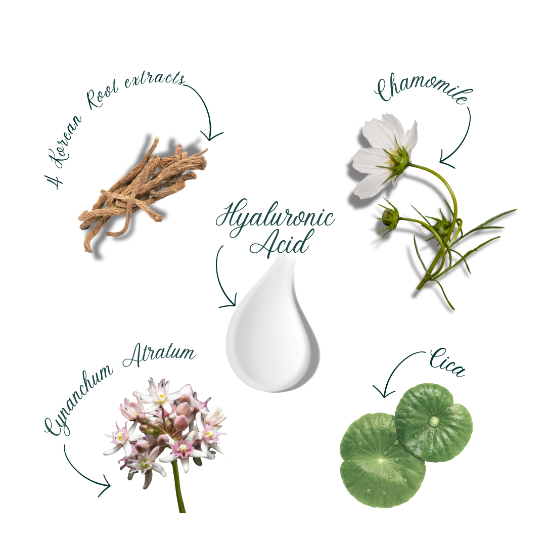 Chamomilla Recutita (Matricaria) Flower Water, Water, Glycerin, Quillaja Saponaria Bark Extract, Butylene Glycol, Dipropylene Glycol, Centella Asiatica Extract, Madecassoside, Asiaticoside, Dextrin, Cynanchum Atratum Extract, Hyaluronic Acid, Sodium Hyaluronate, Hydrolyzed Hyaluronic Acid, Hydrolyzed Sodium Hyaluronate, Rosmarinus Officinalis (Rosemary) Leaf Oil, Gluconolactone, Cyclodextrin, 1,2-Hexanediol, Caprylyl Glycol, Hydroxyacetophenone, Arginine, Polyglyceryl-10 Laurate, Polyglyceryl-4 Laurate, Caprylyl/Capryl Glucoside, Disodium EDTA